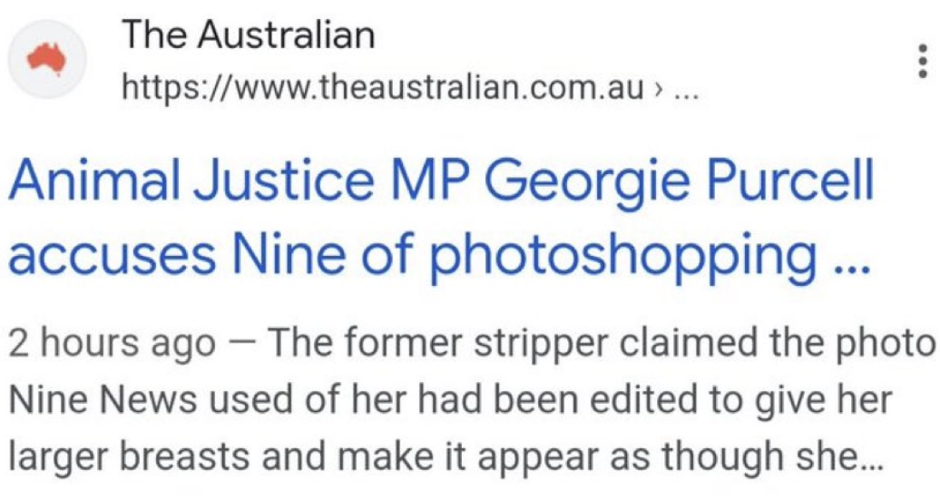 Georgie Purcell, member of the Legislative Council for Northern Victoria and member of the Animal Justice Party found out that a news segment broadcast by Channel 9 on Monday contained a digitally altered image of her. As well as resizing an image they randomly took from the internet (which would most likely be a breach of copyright against whoever took the photo), they also gave her bigger boobs and a crop top. Then The Australian added to the veritable bacchanalia of misogyny by mentioning the MLC was a former stripper.