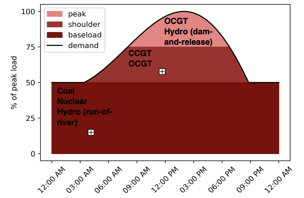 Traditional, simple dispatch of generation technologies according to cost and flexibility