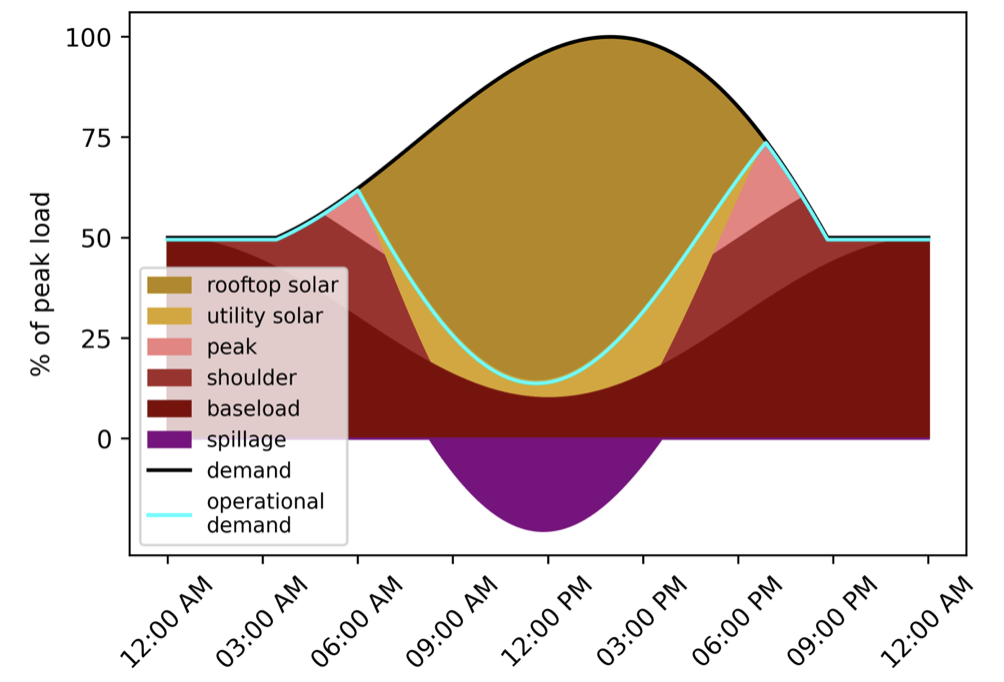 In a system with lots of solar, prices fall dramatically at around midday because solar has no fuel cost. Because much of Australian solar is on rooftops, grid demand also falls. For those hours, baseload generators must either operate at a loss or shut down. Continuing to generate produces more energy than the grid requires at very low or negative prices. This is not a conscious choice—it is the structure of the market that the cheapest bid gets dispatched first.