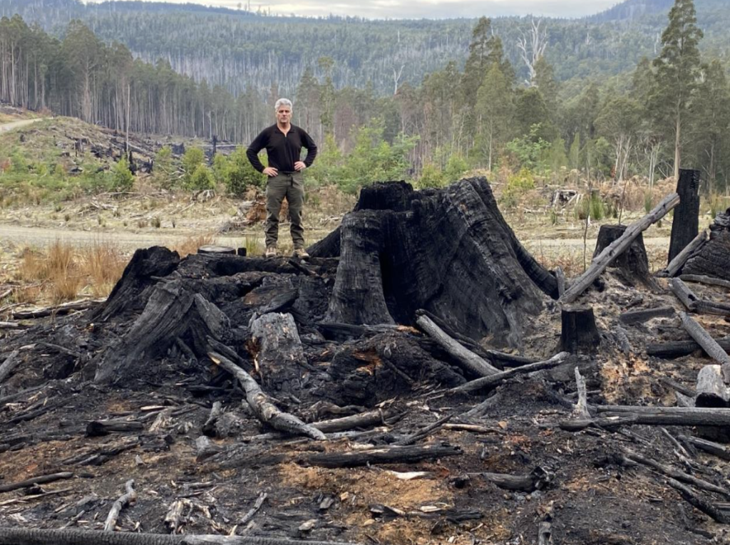 Logging coupe and large burned stump, Hartz Mountain, Tasmania, June 2024 Image: supplied