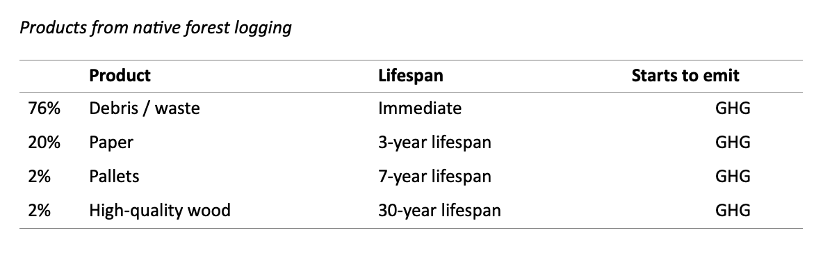Of the 40% taken out as logs, half becomes paper products (20% of initial biomass), with an average lifespan of three years before going to landfill to generate greenhouse gas emissions. 2% of the initial biomass becomes pallets (maximum lifespan of seven years); and 2% becomes high-quality timber (average lifespan 30 years); the rest (16% of the initial biomass) is debris. Life‑cycle analyses show genuine long‑lived products are better sourced from plantations with far lower emission intensities.