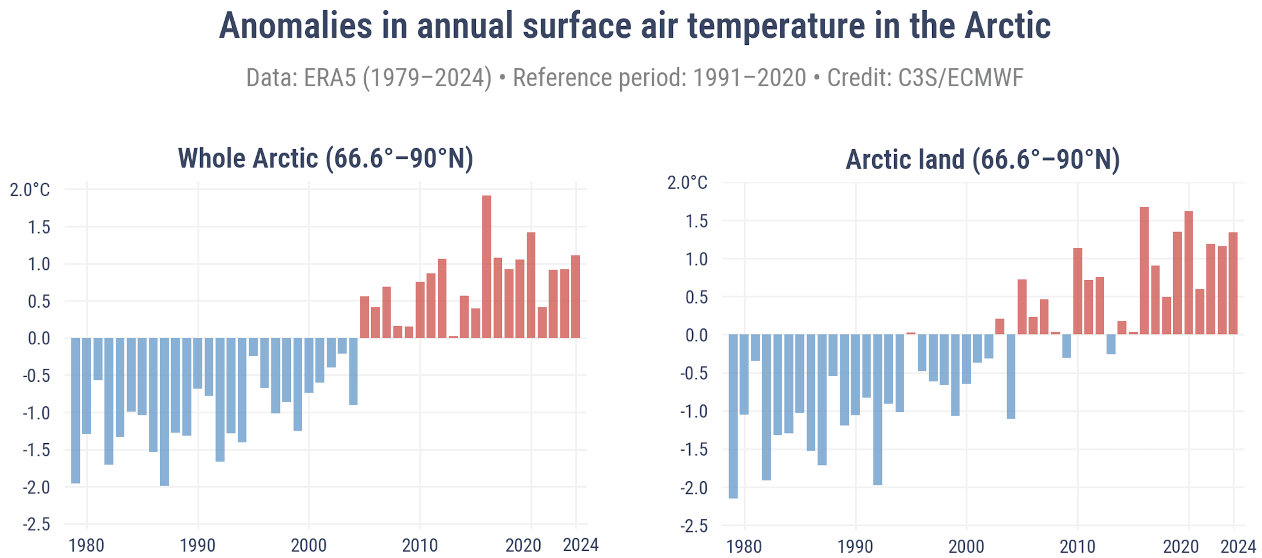 Europe and the Arctic have warmed the most over the last 30 years and their rate of warming has been more than double the global average of 0.26oC per decade. (Note that in the graphs below the reference period for the warming comparisons is 1991-2020.)