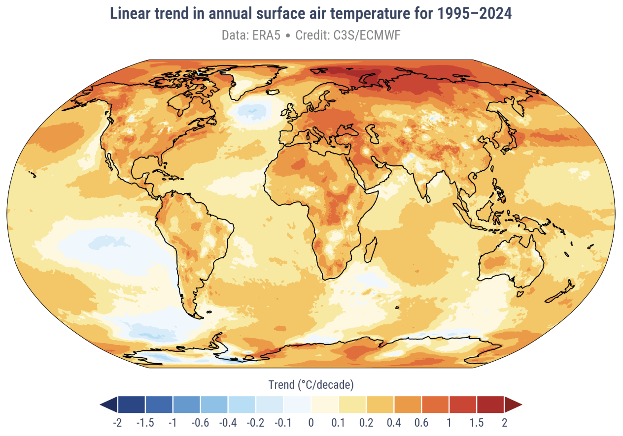 A few weeks ago I described how the world is getting both hotter and hotter at an increasing rate, how the average global warming for 2023 and 2024 combined exceeded 1.5oC (compared with the average for 1850-1900), and how the world’s carbon budget for keeping the official measure of warming under 1.5oC will be completely spent by October 2027. The focus was on global averages but different parts of the world are experiencing different levels and different rates of warming. To illustrate, because land absorbs heat more quickly than water, the temperature over land is higher than over the oceans, and wind patterns and the proximity of extensive tree cover can lead to regional differences