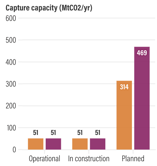 CCUS currently captures 51 Mt of CO2 per year; somewhere about 0.1% of current global CO2 emissions. The histogram below shows the current capture capacity of CCUS operations around the world at various stages of development. The orange and purple bars are the estimates of different agencies.