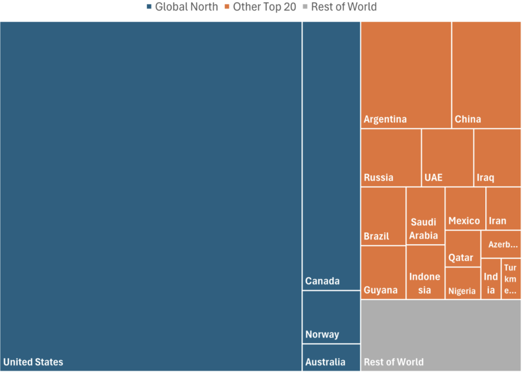 According to Oil Change International, four rich Global North countries (US, Canada, Norway and Australia) will be responsible for 70% of the global CO2 emissions that will be generated by the oil and gas produced in new fields and fracking wells developed between 2025 and 2035. The 32 gigatons (Gt) of CO2 produced by only the new developments in only these four countries are equivalent to three times the annual emissions of all the world’s coal-fired power stations. (“New” refers to facilities that are not yet even under construction and potentially might still be stopped.)