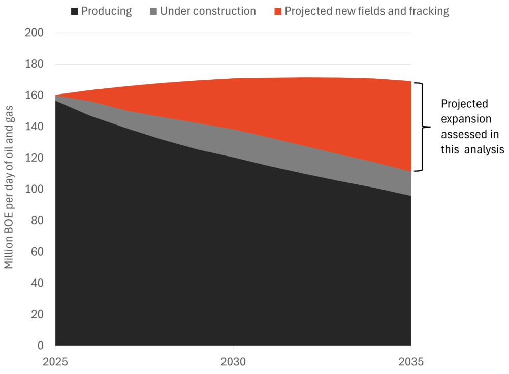 The principal reason behind countries’ plans for new oil and gas fields has little to do with expanding production, but rather to maintaining it as existing facilities dry up. This is well demonstrated in the next figure of projected global extraction in existing, under construction and new facilities between now and 2035 (BOE = barrels of oil equivalent).