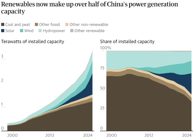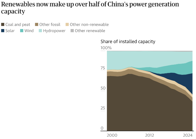 If we focus on China (where would we be in the global transition if it weren’t for China), the next figure demonstrates that in 2000 non-renewables, principally coal, provided marginally over three-quarters of all China’s power generation capacity, with the rest being provided by hydropower. By 2024, however, non-renewables had fallen to well under half of all power and solar and wind had surged.