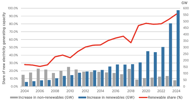 The figure below provides a snapshot of the annual growth in capacity among non-renewables and renewables over the last 20 years and the share of all power provided by renewables.