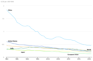 Nationally, the percentage increases in CO2 emissions in 2021 were mostly in the 1-10 per cent range, with Europe and the USA registering 7 per cent and China 5 per cent. In terms of absolute numbers, China dominated the field, of course, and their per capita emissions are now marginally above the average of the advanced economies (over 8 tonnes per person per year). China has, however, made a dramatic reduction in its CO2 emissions intensity – the amount of CO2 emitted per dollar of GDP. In 1980, China’s emissions intensity was 1.8 tonnes of CO2 per US$1000 of GDP but by 2021 this had fallen to 0.45 tonnes (still double that of the USA).