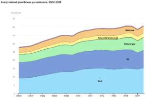 Globally, total greenhouse gas emissions from energy and industry also reached a new peak in 2021, 40.8GtCO2eq – marginally higher than the previous peak in 2019. Almost 90 per cent of total greenhouse gas emissions from energy and industry is CO2.