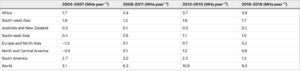 The amount of land devoted to growing crops has expanded by 125 MHa over the last twenty years (about the size of South Australia) and it’s expanded at a higher yearly rate in the last decade, as demonstrated in the table below. The biggest increase and the most rapid acceleration has been seen in Africa (total increase of 47 MHa). Despite a slowing rate, South America has also seen its cropland expand by 34 MHa since 2003.
