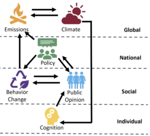 The climate and energy models used to link future levels of greenhouse gas emissions to concentrations of greenhouse gases in the atmosphere and the likely global warming have become increasingly complex, sophisticated and reliable. Missing from these models, however, are individual and social factors such as personal perceptions of climate change, beliefs about the efficacy and cost of climate action, human behaviour change, public opinion, the influence of social networks and policy changes. The links between these factors and the level of global warming we can expect in 2100 are complex but not unknowable, according to a recent study that has developed a climate-social system model that includes consideration of these factors at individual, social, national and global levels (see figure below).