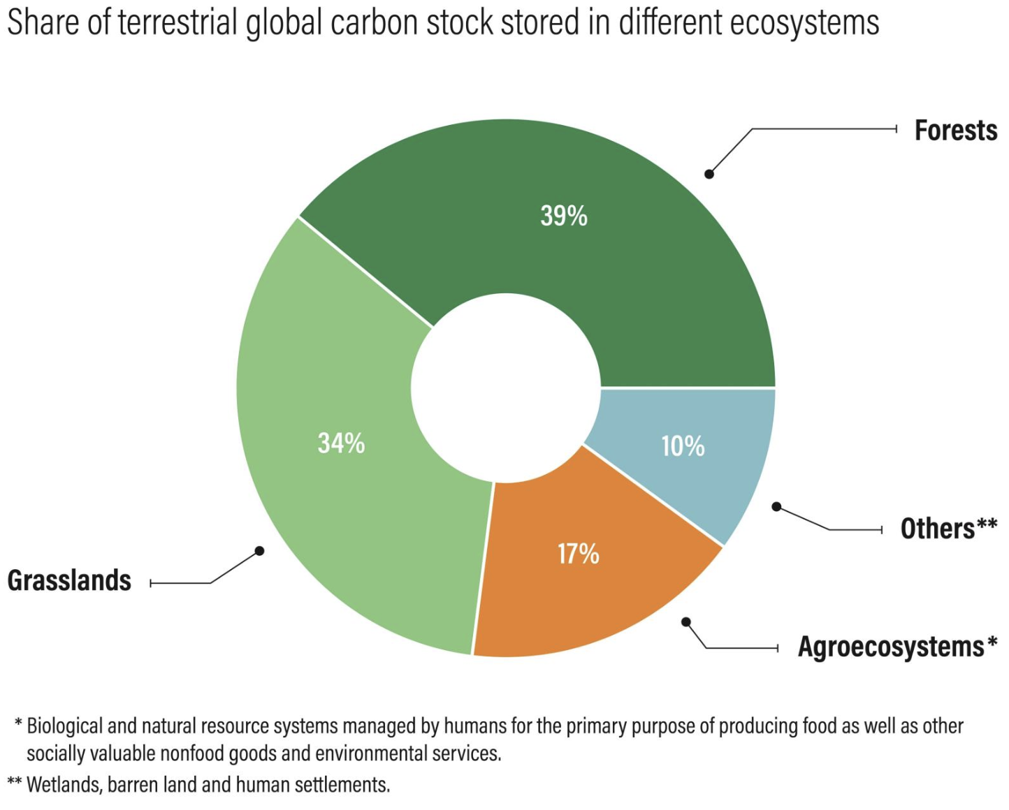 Grasslands also have an important role in mitigating climate change as they hold a third of all the world’s stores of terrestrial carbon, most of it underground. Almost as much as forests (figure below).