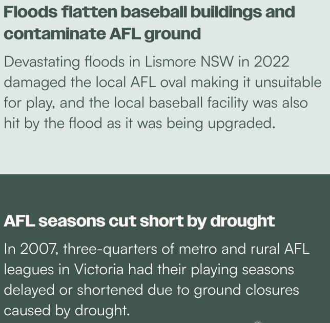 Heatwaves, droughts, floods and bushfires are all consequences of climate change and all are potential causes of illness and injury during professional and community sporting activities. The Environmental Defenders Office has released a four-step guide for club members and local sports clubs to help them avoid the harmful effects (and associated legal risks) of extreme weather events during sporting activities: