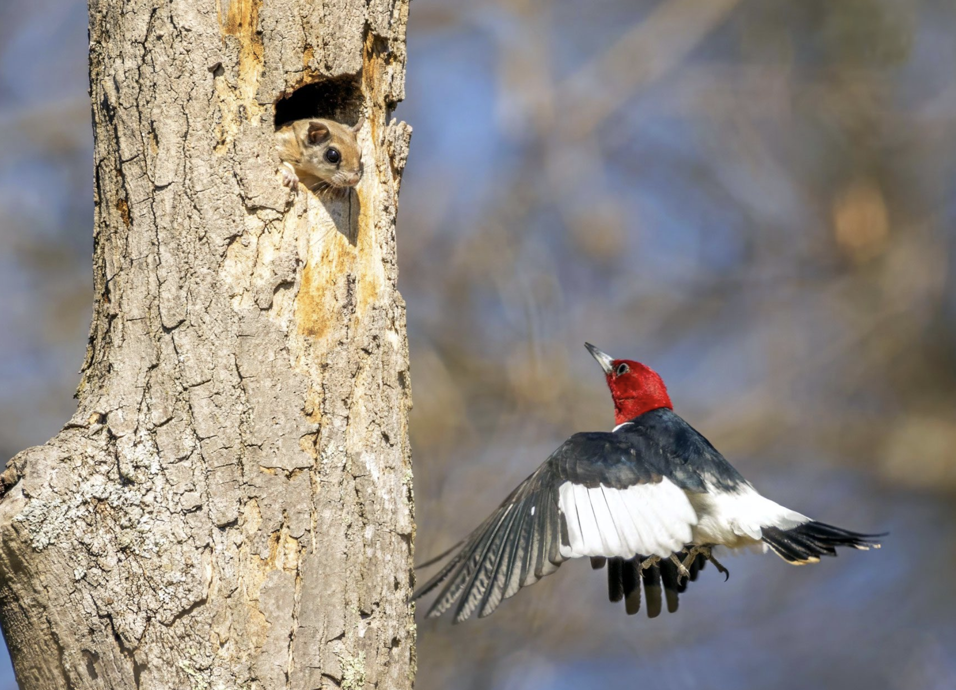 A Red-headed Woodpecker finds a tree cavity claimed by a flying squirrel. Photo by Bob Rumer/Birdshare.