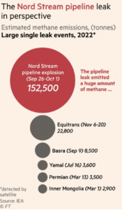 The top graphic clearly displays the enormous size of Nord Stream’s leak compared with other recent leaks. The lower graphic compares Nord Stream (the red dot at the bottom) with the methane emissions of selected methane-emitting countries last year. At first glance, Nord Stream looks relatively small but its leak was equivalent to the amount released every day by all global fossil fuel operations – so not that inconsequential.