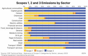 The figure below displays the relative sizes of the scope 1, 2 and 3 emissions in various industries. Only in the cement, steel and transport industries are the scope 3 emissions a relatively small part of the industry’s total.