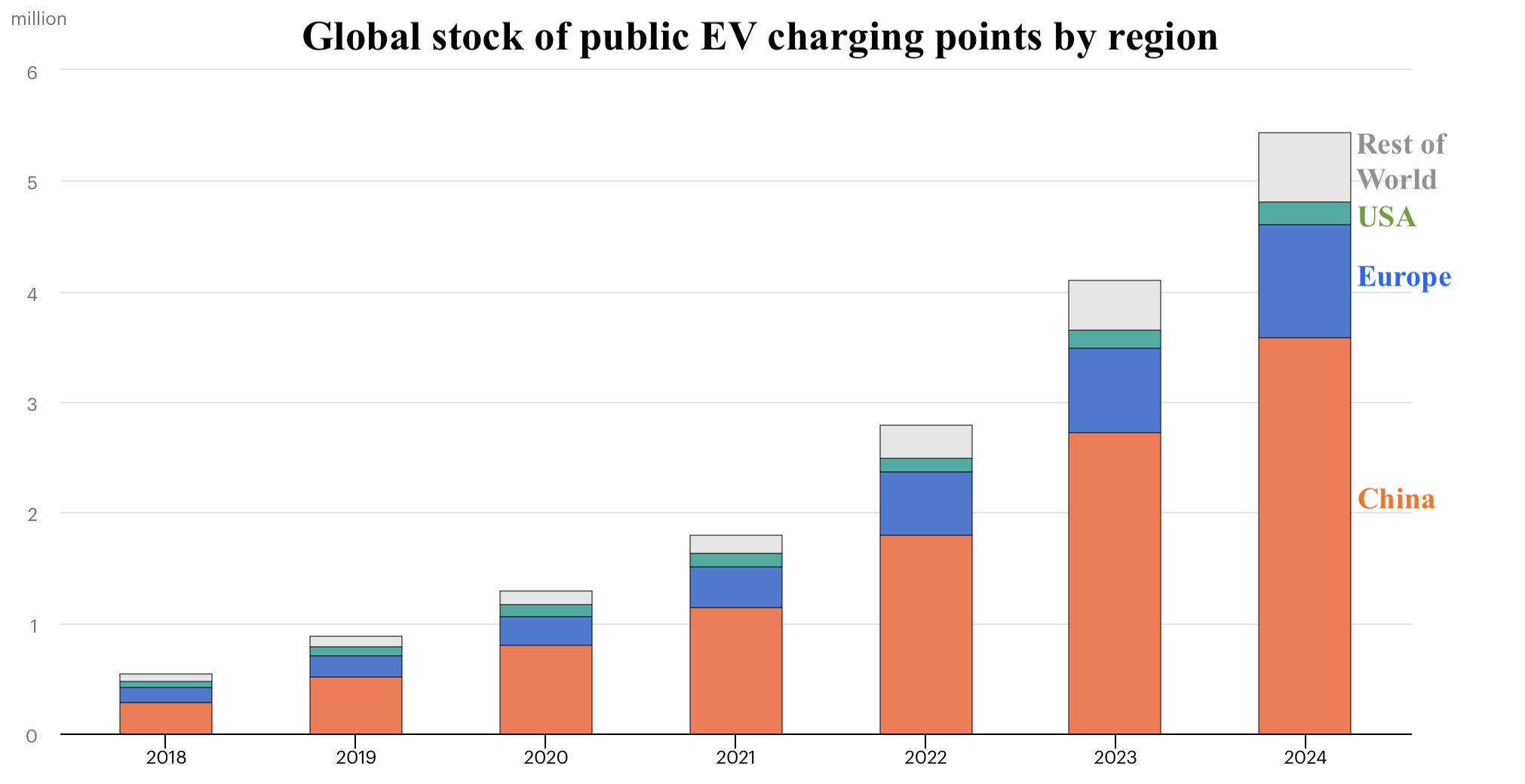 No prizes for knowing which country has the most EV charging points, having secured a 12-fold increase from 280,000 in 2018 to 3.6 million in 2024. The US isn’t embracing EVs with the same enthusiasm, but numbers have increased from 60,000 to 200,000 in the same period.