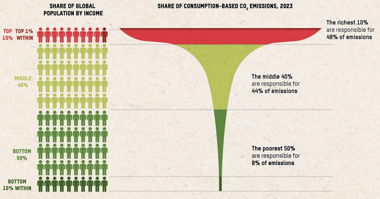 In 2023, the richest 10 per cent of the world’s population were responsible for almost half of all consumption-based emissions of CO2; the poorest 50 per cent contributed 8 per cent.