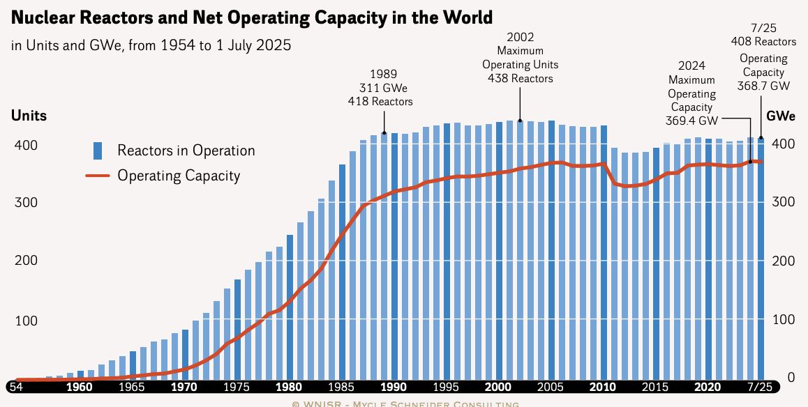 In mid-2025, 31 countries had 408 operational reactors, 30 below the 2002-peak. Also in 2025, 11 countries were building 63 reactors, with little change in numbers over the last few years. China is building the most (32, of which 31 are inside China) and Russia is second (27 in total, 20 of them in other countries). Sixty of the construction projects are associated with states that possess nuclear weapons.