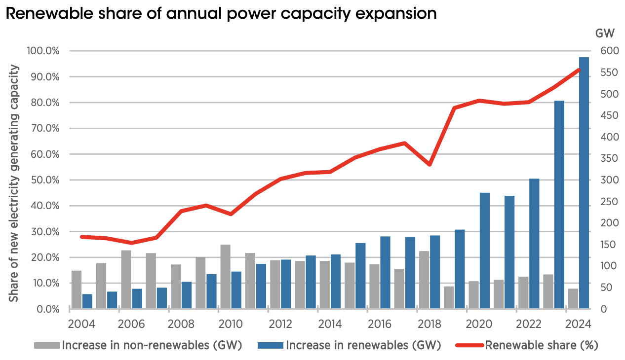 - In 2004, renewable energy accounted for less than 30 per cent of annual power capacity expansion, by 2012 it was 50 per cent and in 2024 it exceeded 90 per cent.
