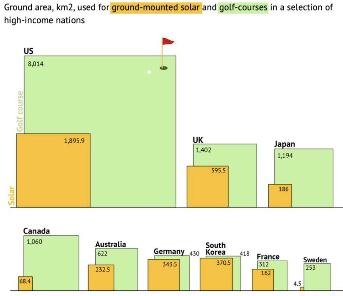 Courses in the top 10 countries occupy about 14,000 square kilometres, roughly the equivalent of six ACTs. In all 10 countries, the area of land occupied by golf courses exceeds that occupied by solar farms.