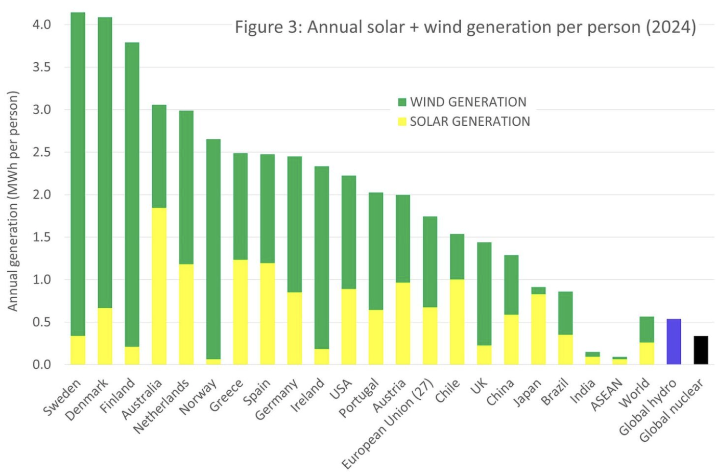 Australia produces more solar energy per person than any other country. We’re more middle-of-the-pack when it comes to wind energy, completely blown away by the Scandinavians. Combining the two, we come fourth. (The original data is in a report by Ember.)