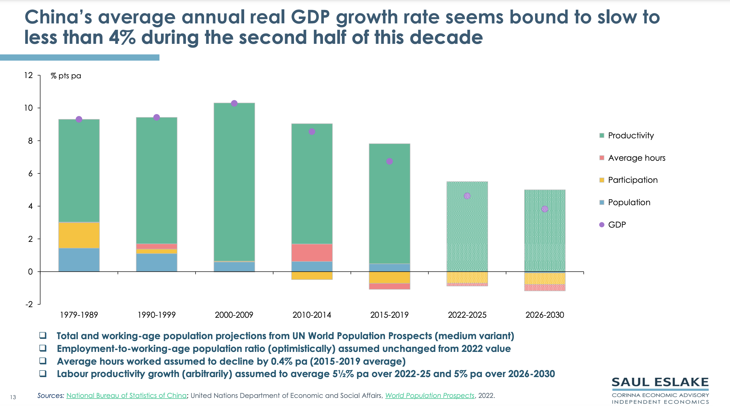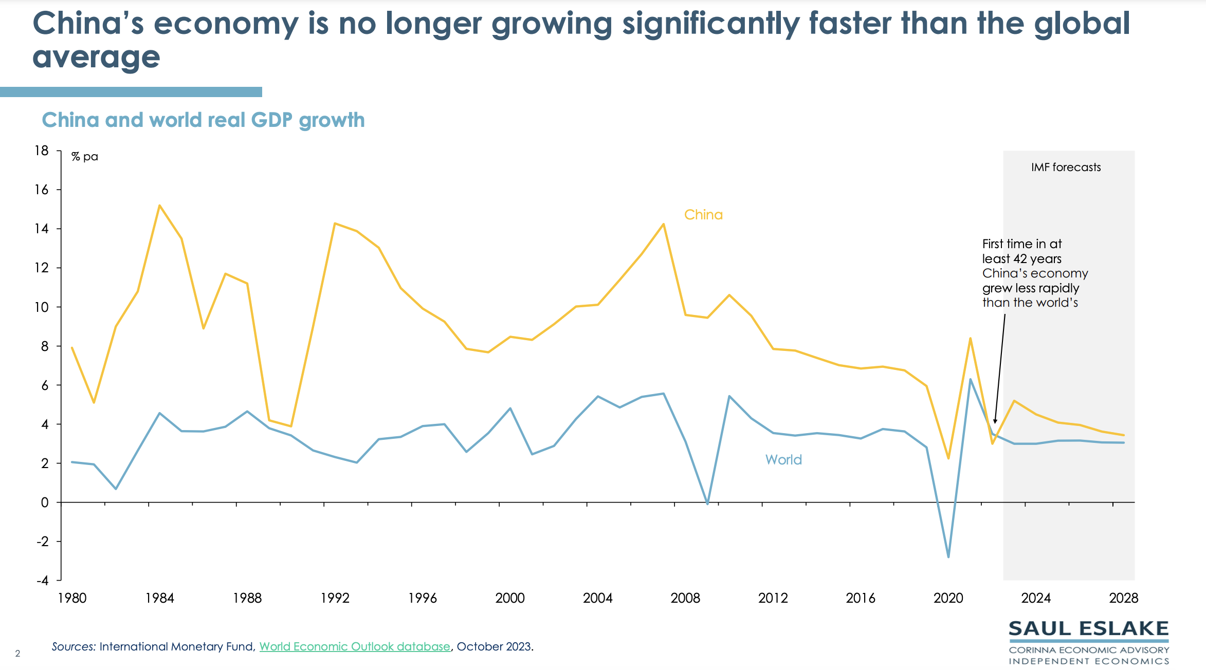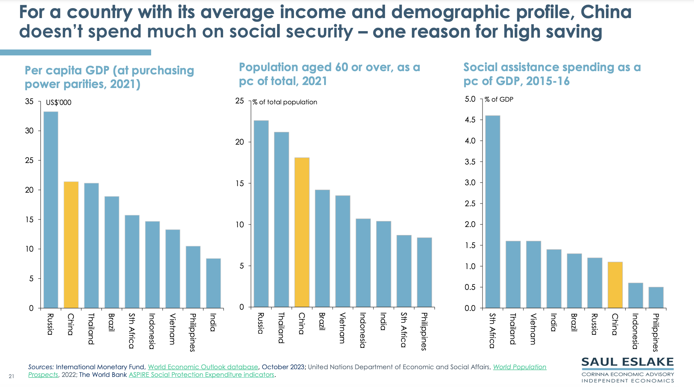 Saul’s chart pack gives a bird’s eye view of the economic challenges China needs to address. By ‘Peak China’ he does not mean that China will collapse, but that its future economic growth will be much slower than in the past.