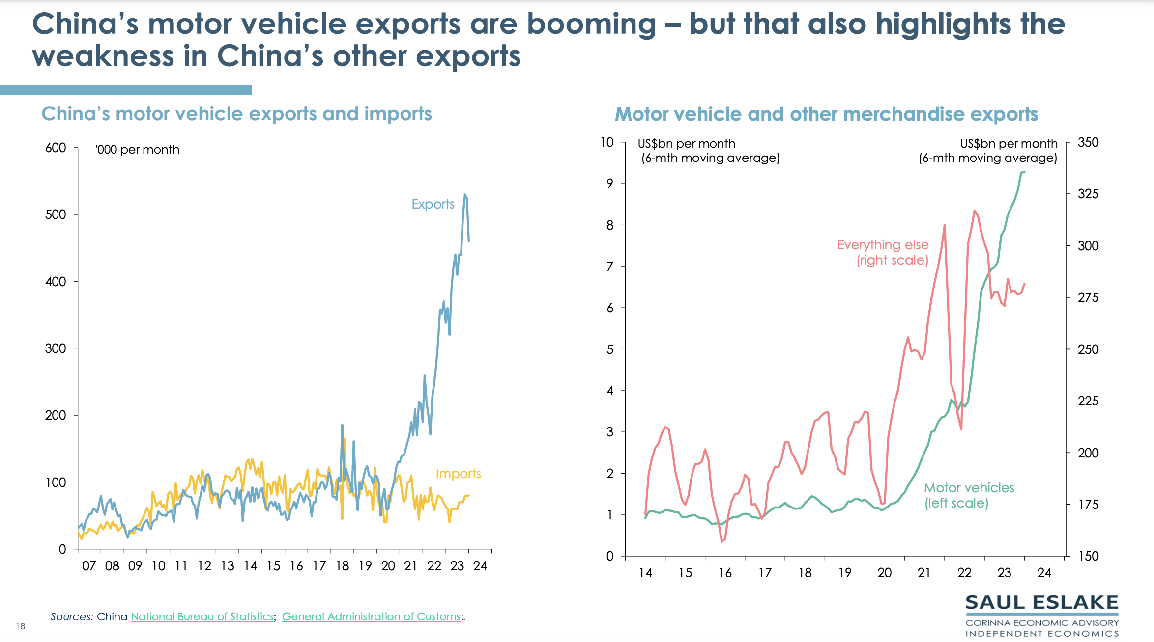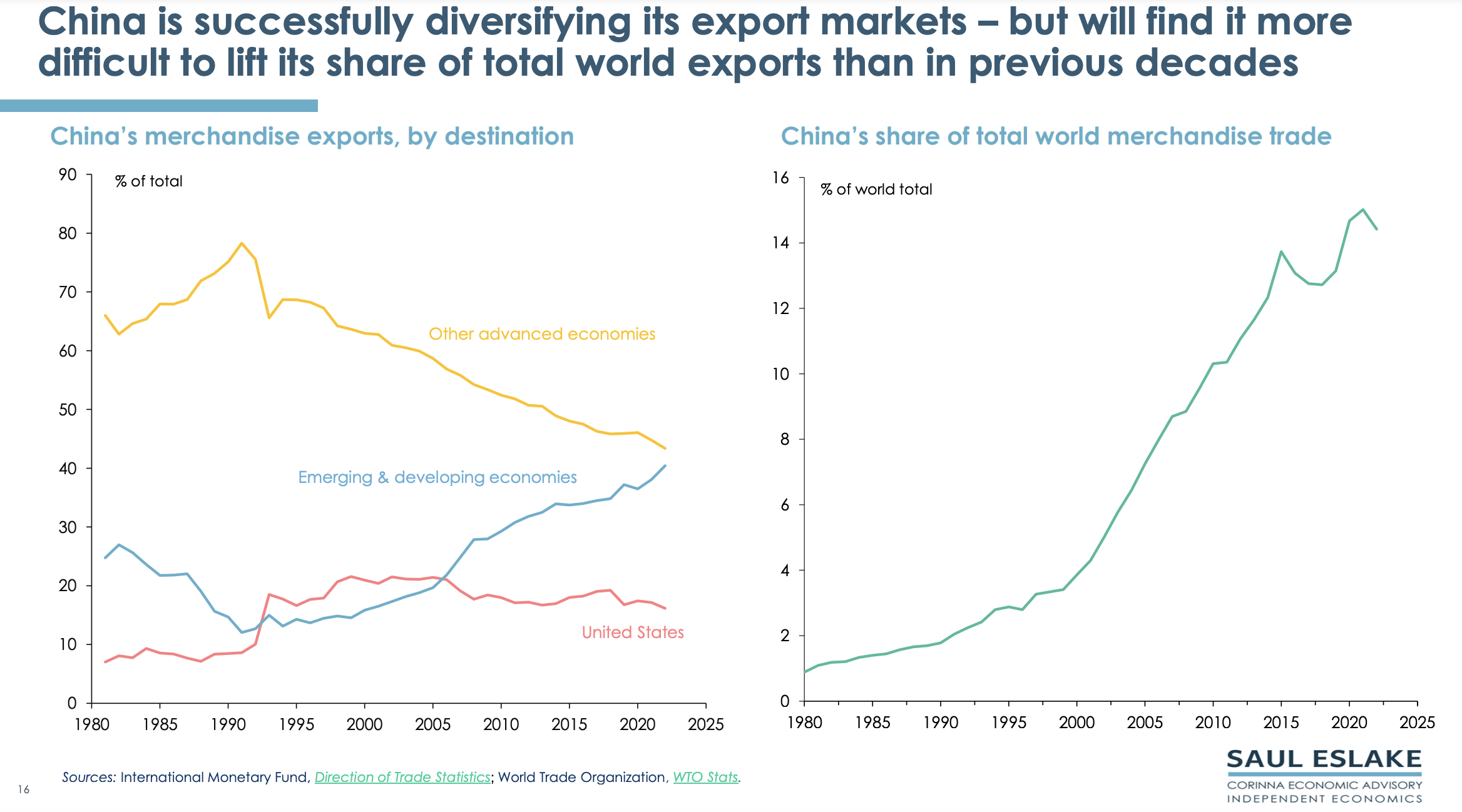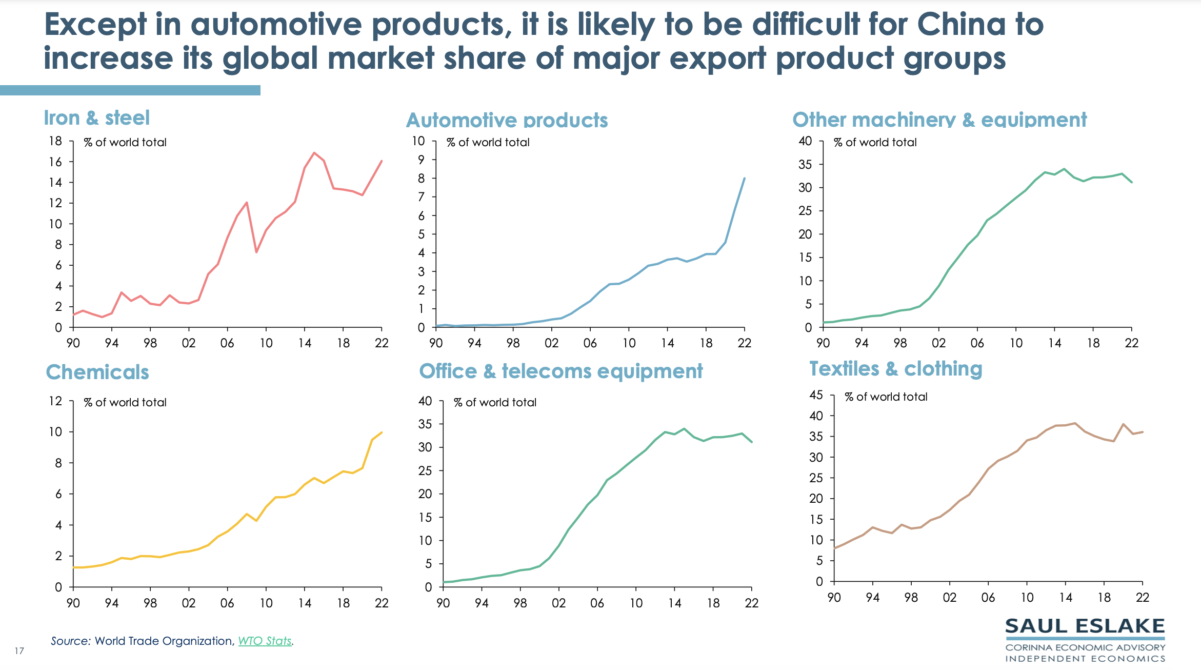 China is reluctant to adopt Western style fiscal and monetary stimulus because that would increase its total debt/GDP ratio which is already one of the highest in the world (especially corporate and local government debt). China is diversifying its exports to the Global South to help offset its falling share to the Global North. Also, its exports of automotive products (especially EVs) are soaring. But this won’t be enough to keep growing its share of world trade.