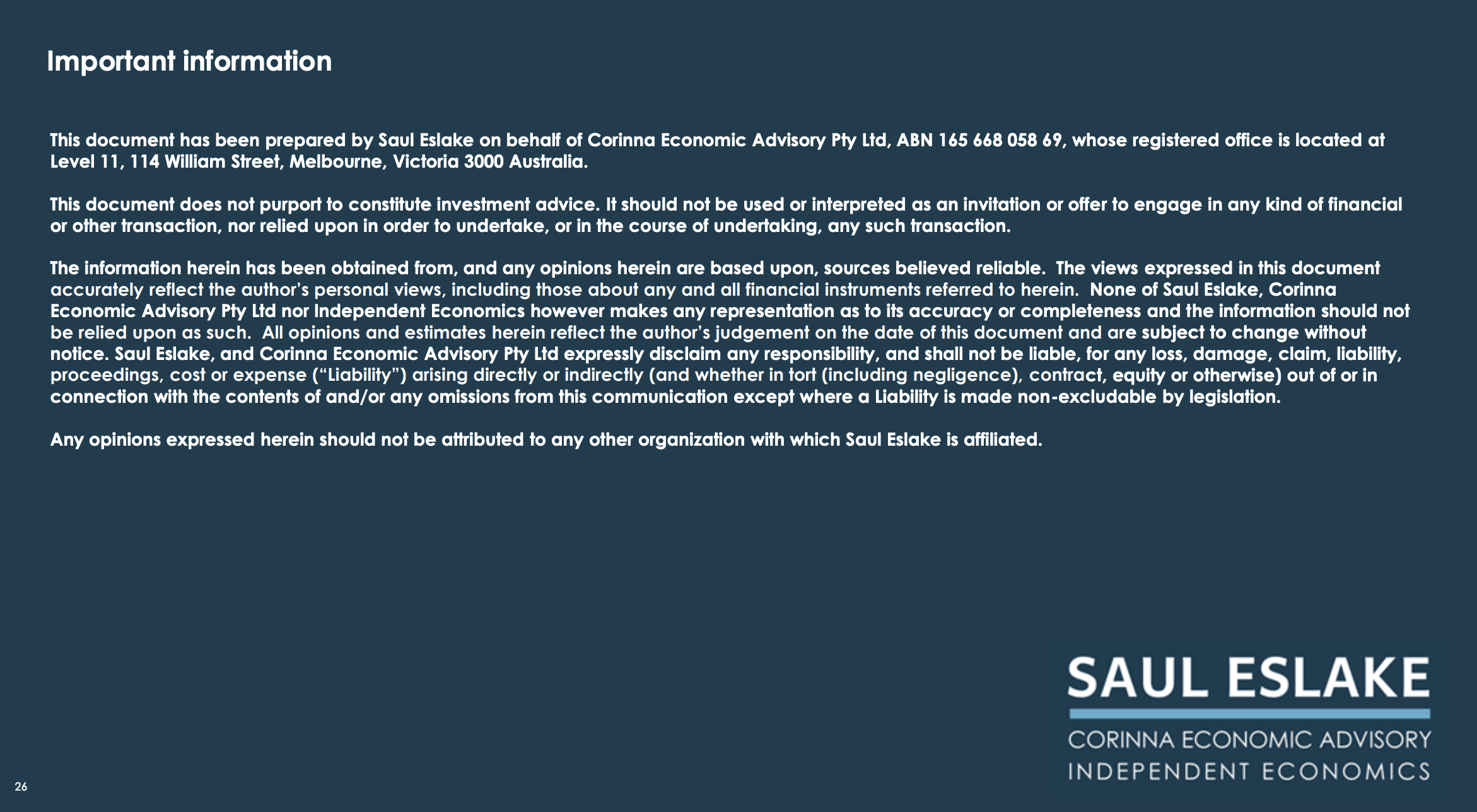 Saul Eslake worked as an economist in the Australian financial markets for more than 25 years, including as Chief Economist at McIntosh Securities (a stockbroking firm) in the late 1980s, Chief Economist (International) at National Mutual Funds Management in the early 1990s, as Chief Economist at the Australia & New Zealand Banking Group (ANZ) from 1995 to 2009, and as Chief Economist (Australia & New Zealand) for Bank of America Merrill Lynch from 2011 until June 2015.