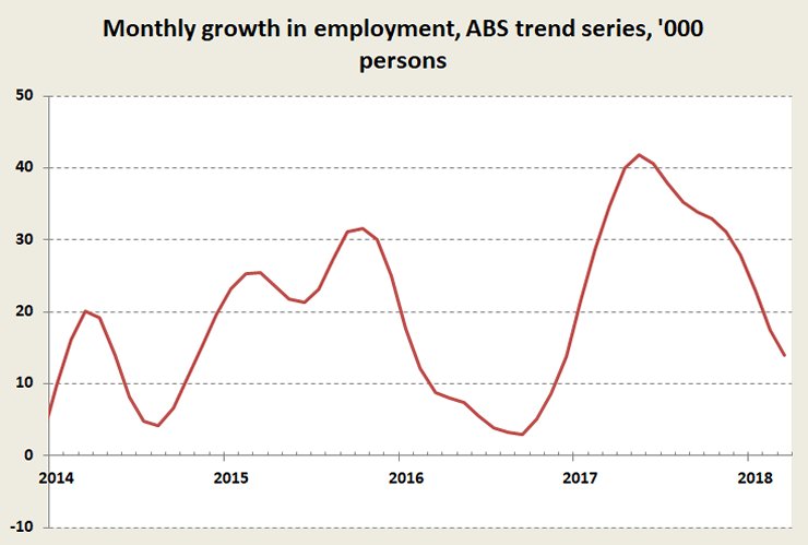 Third, in terms of employment growth this may be as good as it gets. The long recovery from the 2008 crisis and the recovery from the end of the mining boom both seem to have run out of fizz. For a time early last year there was strong employment growth, but subsequently it has fallen away sharply, as shown in the graph below.