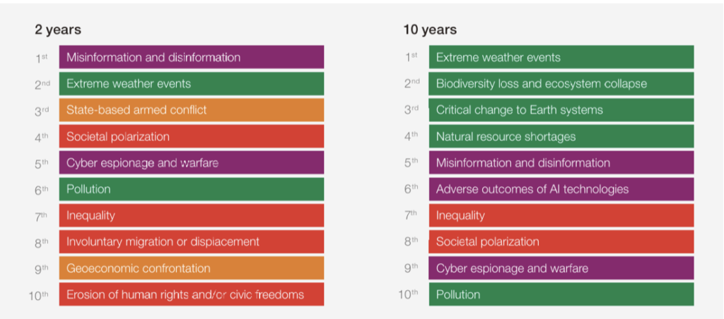 “The global outlook is increasingly fractured across geopolitical, environmental, societal, economic and technological domains,” the WEF states, noting “expansion and escalation of conflicts, a multitude of extreme weather events amplified by climate change, widespread societal and political polarisation, and continued technological advancements accelerating the spread of false or misleading information.”