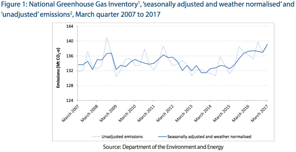 Total Australian emissions from all sources, after declining significantly in the period 2010 to 2014, which included the period when a carbon price was in operation, has since resumed an upward trajectory as can be seen from the figure from the Quarterly Update of Australia’s National Greenhouse Gas Inventory.