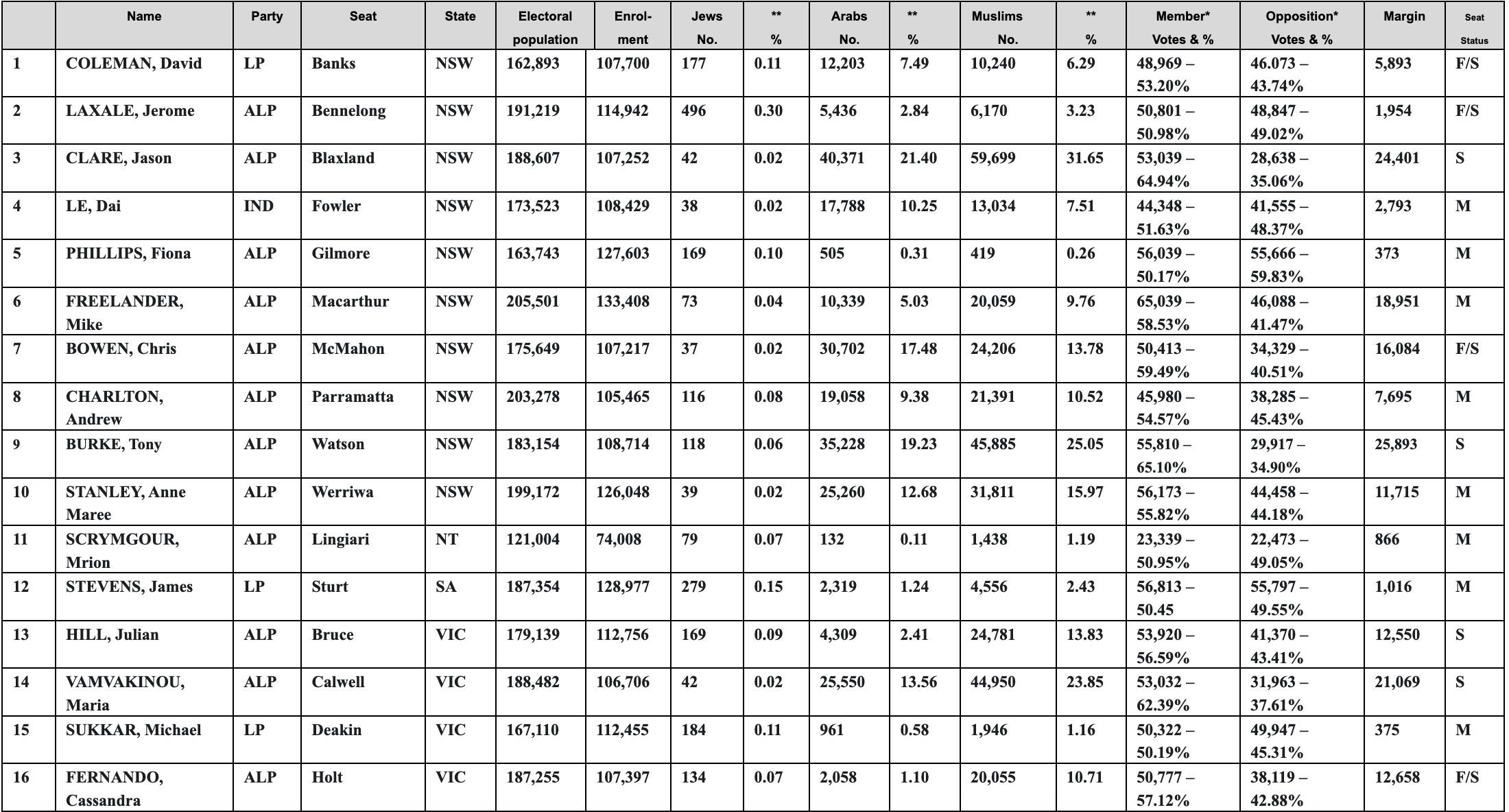 Due to the large size of the data analysis, here are the 21 seats in which the Australian Muslim and Arab communities have most voting influence and the four seats in which the Australian Jewish community has most voting influence.