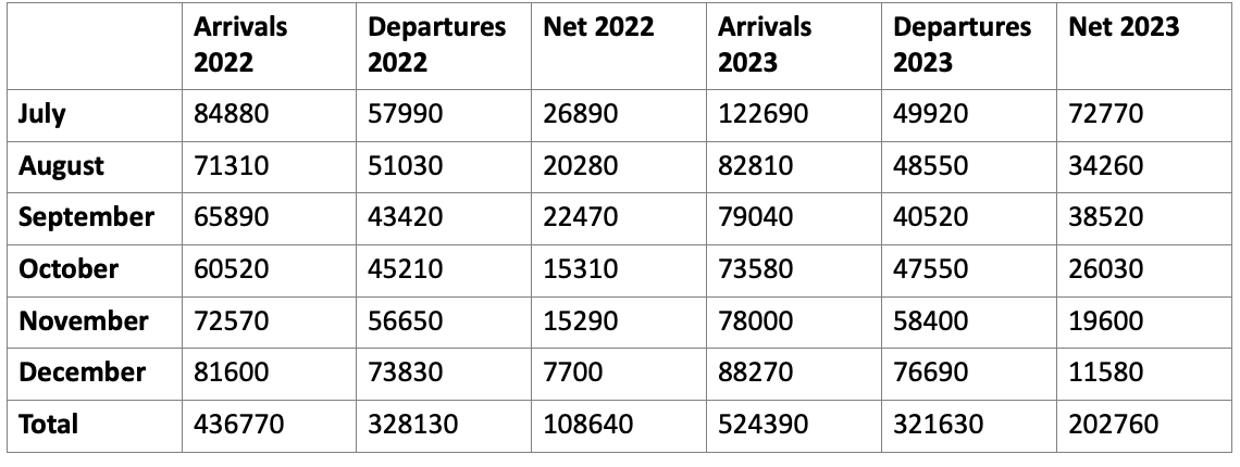 Permanent and long-term movements are the earliest approximation of net migration that the Australian Bureau of Statistics (ABS) publishes. The data for December shows net permanent and long-term movements for the six months to December 2023 was around 96,000 higher than in the six months to December 2022 (see Table 1).