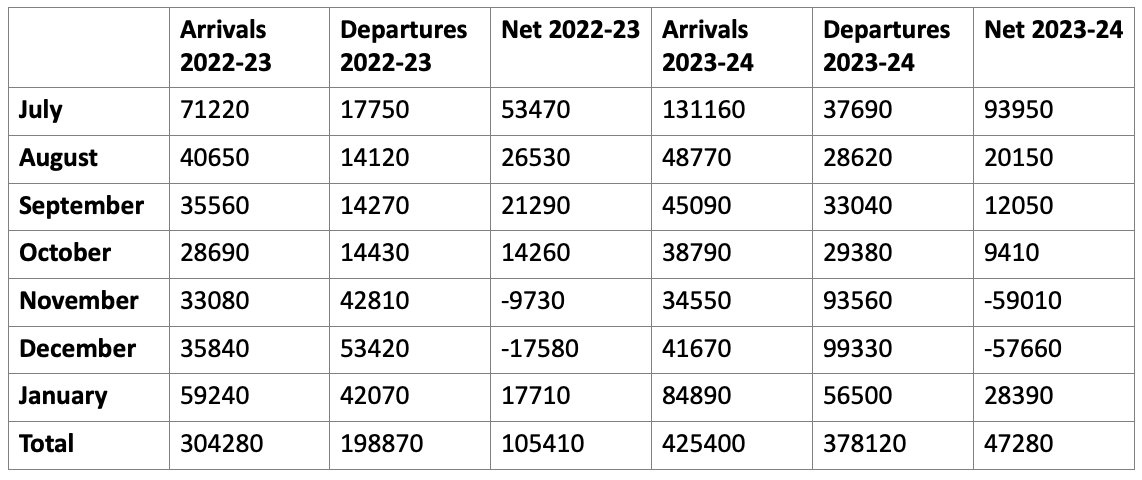 While student arrivals have remained stronger in the first seven months of 2023-24 compared to the same seven months in 22-23, departures have increased more strongly compared to 2022-23. What we don’t know is the extent to which the departures are just short term or are longer-term departures. This may be confirmed over the next few months.