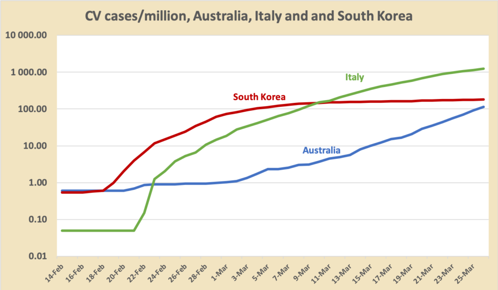 We have updated the graph of cases in Australia compared with South Korea, and we have now added Italy. One reader pointed out that because those countries have different populations (Australia 25 million, South Korea 52 million, Italy 61 million) we should normalise for population, which we have done, expressing cases per million population.