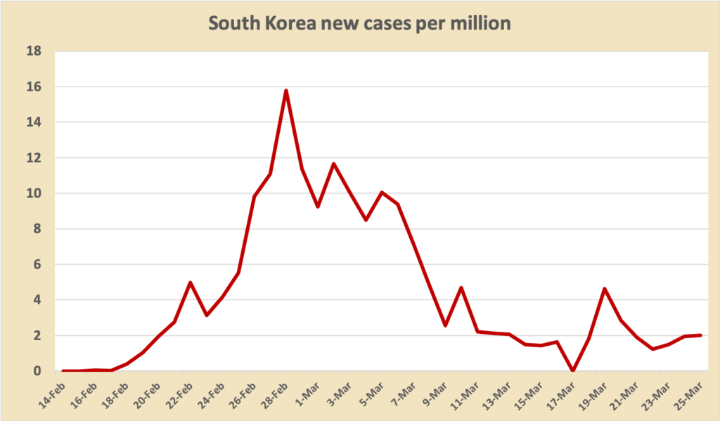 There are two curves showing the progress of coronavirus. The first is the accumulated number of cases; the second is the daily number of new cases.  A stock and a flow.  On the ABC’s Breakfast program, Dr Pankaj Jain of the University of New South Wales explains the difference.  Both China and South Korea seem to have successfully bent the curve – China by strong lockdown and restriction of movement, South Korea by extensive testing and tracing contacts.  The South Korean accumulation curve is in the diagram above while its flow curve is below: it’s lumpy because only small numbers are involved.  Also, because the numbers are small, the Y axis is linear. (Those who are mathematically minded will realise that it’s the first derivative of the accumulation curve.)