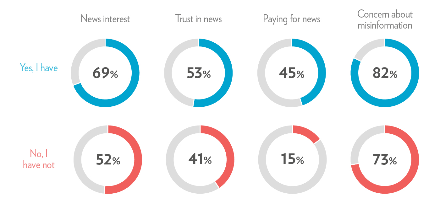 Not only are people with news education more likely to pay for news, they are also more interested in news and less likely to avoid it. While they are more likely to be concerned about misinformation, their knowledge of how things work in an online environment means people with news literacy are not deterred by this because they feel more confident in their ability to discern misinformation.