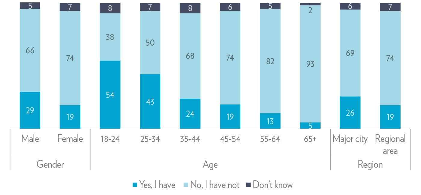 The majority of participants (70%) in our survey say they have not had any news literacy education or training. There is a big generational gap. Only 5% of participants aged 65 or older say they have received any kind of education about the news over their lifetime, compared to more than half of 18-24-year-olds. Notable differences are also found between men (29%) and women (19%), city (26%) and regional participants (19%).