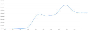 Talking of the popularity of climate-related terms, the two graphs below chart the frequency of use of the words ‘global warming’ and ‘climate change’ in the English language over the last 50 years. Usage of both seems to have reached a plateau which is a little surprising.