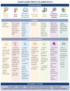 And of course, while everyone is at risk of the harmful health effects of climate change, and will be increasingly so, it is the most vulnerable individuals, communities and nations who are at greatest risk, have the least ability to mitigate risks, and have the poorest access to personal and public resources to deal with illness and injury when they occur. This entrenches vulnerabilities and creates intergenerational poverty and ill-health. The varied health risks associated with climate change are nicely summarised in the graphic below from a World Resources Institute (WRI) report.