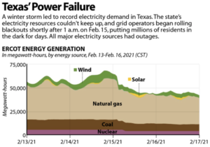 Texas is a long way away … and it spawned George W Bush … and it voted for Trump in both 2016 and 2020 … so who cares if they’ve been experiencing life in the deep freezer recently? Well, prejudice and jocularity aside, perhaps Australia can learn from others’ experiences when extreme weather conditions present unprecedented stresses that cause power systems to collapse. The simple fact is that all power systems are will come under increasing strain over the next few years for two unavoidable reasons. First, global warming is going to create more extreme and more frequent heat waves, cold snaps, cyclones, floods, etc., often in places that have never experienced such events before. And create peak demands at unusual times of the year. The Texas power system was built around peaks in summer heat, not winter chills. Second, all energy systems are going to be in transition, whether it be converting from fossil fuels to renewables or growing from a very rudimentary system to one that services a developing nation’s 21st century population and economy. A third lesson is that there will always be some who ignore the facts and spread false news to further their agenda. Texas did not black out because wind power failed as claimed by some – although wind turbines did freeze – but because all power sources (except solar which actually increased its output) failed when demand soared on February 15th. The main culprit was gas but coal and even nuclear also let the side down, as the graph below shows.