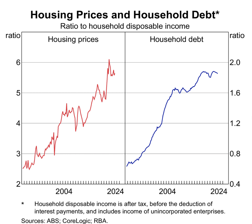 First, the size of a mortgage that has to be serviced depends upon the price of the dwelling, and over the last forty years housing prices have more than doubled relative to incomes from around 2½ per cent to around 5¾ per cent of household disposable income (see Chart 1).