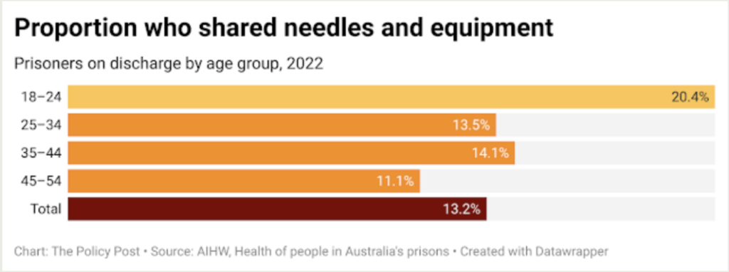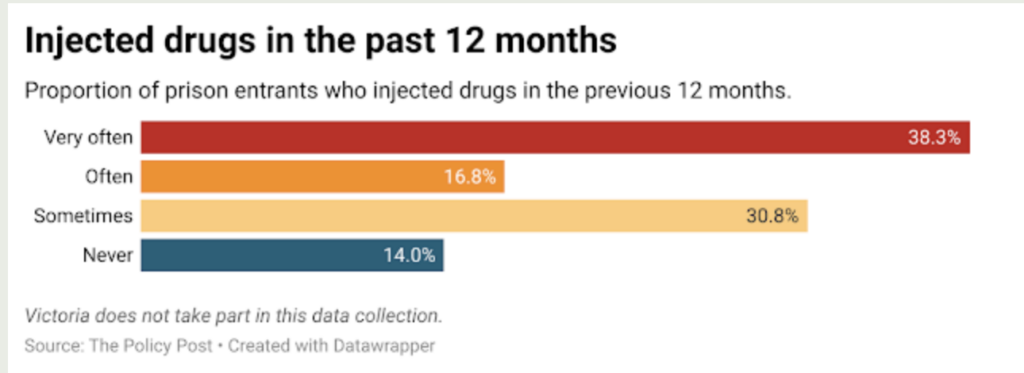 Drug use, and particularly injecting drug use, is extraordinarily frequent among prisoners. Although drugs and clean needles are generally banned in prisons, addictions do not magically disappear when someone goes to gaol. Injecting is in itself a serious cause of health harm, from infectious diseases – hepatitis B and C, HIV – from overdose and from the effects of the drugs and the impurities they often contain.