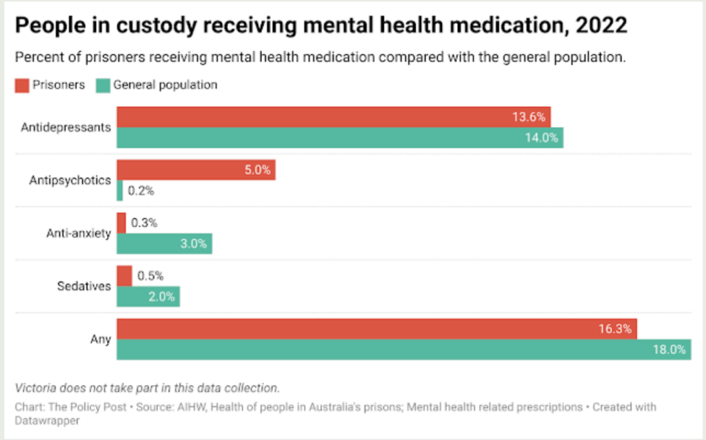 A very high proportion of prisoners are in gaol partly or wholly because of their mental health conditions. One indicator is the level of prescribing of anti-psychotic medication: 5% compared to 0.2% in the general population.