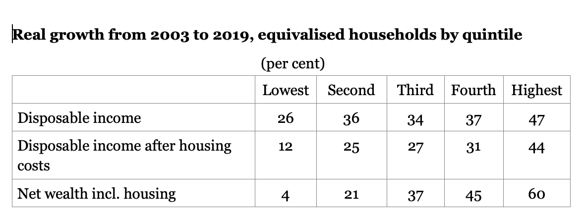 As can be seen from Table 2 below, over the period from 2003 to 2019, the increase in disposable income was not that different between the five quintiles in the income distribution; indeed, for the three middle quintiles the rate of income increase was almost the same. By contrast, the increase in wealth is much more different between the five quintiles, and the inequality of wealth has increased much more than for incomes.