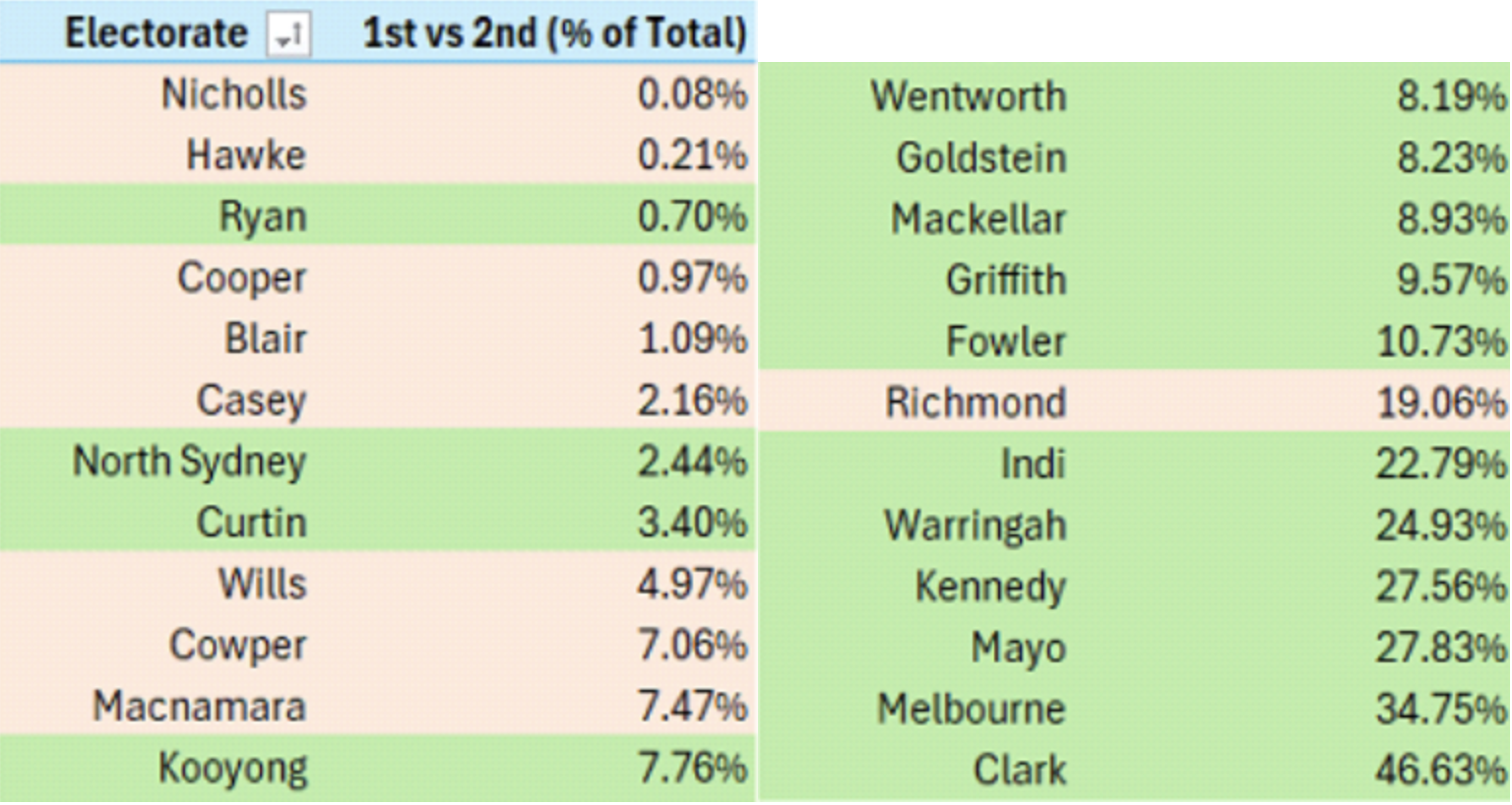 The table above shows all 24 electorates where more first preference votes went to the Crossbench cohort, and the percentage of fewer votes the second place major party received.