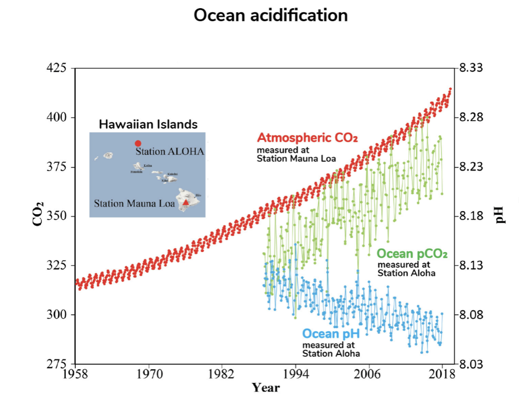Figure 2. The rise in CO2 of the atmosphere and oceans and the rise in ocean acidity (decline in pH) https://ugc.berkeley.edu/background-content/ocean-acidification/