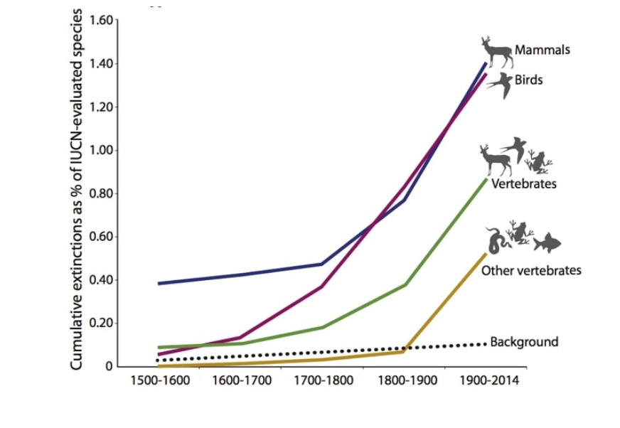 Cumulative vertebrate species recorded as extinct or extinct in the wild by the IUCN (2012). Dashed black line represents background rate. This is the ‘highly conservative estimate’. Source: Ceballos et al. (2015).